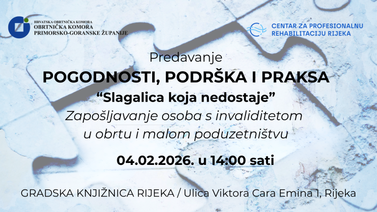 Obrtnička komora Primorsko-goranske županije u suradnji sa Centrom za profesionalnu rehabilitaciju Rijeka organizira praktičnu edukaciju namijenjenu obrtnicima POGODNOSTI, PODRŠKA I PRAKSA “Slaga